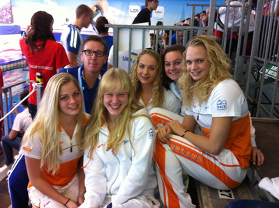 "Sweet sixteen en lid van het OTT in Chartres. V.l.n.r. Esmée Bos, Maaike de Waard, Rosa Veerman, Denise van Ark en Cynthia Verkaik. Geheel links jeugdbondscoach Titus Mennen. Foto Swimjos