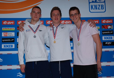 Twee succesvolle zwemmers van het RTC Drachten: Stefan Hazeleger (l.) en Sébas van Lith. Rechts Mateusz Kobus (One Team Swimming). Foto Ton van Veen.