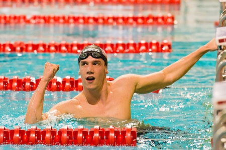 Job Kienhuis na zijn 14.58.34 op de 1500m vrije slag tijdens het OKT/ONK in Eindhoven 2011. Foto Kees Jan van Overbeeke