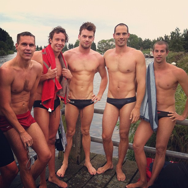 Voorbereiden op de Amsterdam City Swim met een training in de Amstel. Olympiers van toen en nu, vlnr Johan Kenkhuis, Sebastiaan Verschuren, Nick Driebergen, Bas van Velthoven en Joeri Verlinden. Foto Instagram via Twitter @sverschuren>