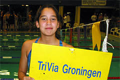 “Een van de trainers van TriVia, Michiel Jelijs, kwam trots naar Oene Rusticus van de Zwemkroniekredactie toe en vertelde dat een van zijn zwemmers, Ranomi Kromowidjojo een BJP had geëvenaard in haar leeftijdsklasse onder de 10 jaar. Dat deed ze zondagmorgen op de 50 meter vrije slag in een tijd van 30.41, Katinka van Vastenhoven van De Dolfijn noteerde in 1994 30.4 seconden. “