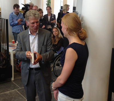 Willemijn Knot, vriendin van Lennart Stekelenburg, mag 'Het heilig vuur' van schrijver Nico Keuning in ontvangst nemen. Foto Swimjos
