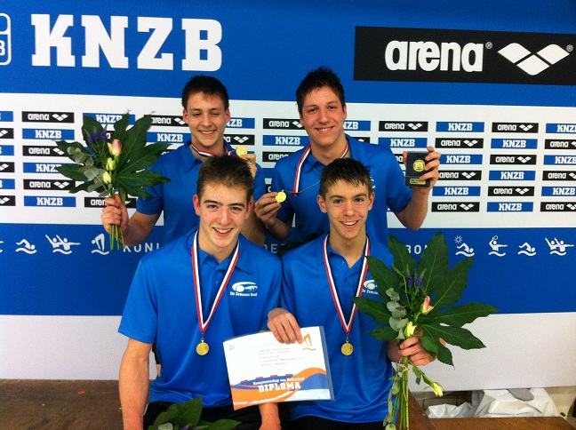Casper Zwier (1.59.23), Jonathan Davidse (1.57.23), Phillip van Moll (2.04.97) en Tom van Elsen (1.59.12) samen goed voor een NR Junioren in 8.00.55