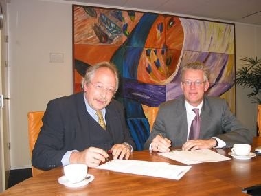 Hans Schonewille, senior Adviseur BMC (l) en Ernst Peter Tamminga, Voorzitter TTZ tekenen de sponsorovereenkomst van BMC met TTZ