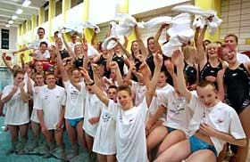 Mail een vriendDe grootste zwemtalenten van Nederland komen uit Hoogeveen. De selectie van plaatselijke Zwem -en Polo Club (ZPC) werd vrijdagavond bij monde van Jos van Kuijeren en Lammie Winters gehuldigd door Speedo Nederland, die jaarlijks de verkiezing van de meest veelbelovende zwemselectie organiseert. De Inge de Bruijns en Pieter van den Hoogenbands in de dop kregen in hun thuishaven, het bad De Dolfijn, zwemkleding en T-shirts uitgereikt. In het juryrapport staat dat ZPC Hoogeveen de zwemsport op een enthousiaste wijze aanpakt. 'Een voorbeeld voor andere clubs in Nederland'. Voorgangers van de ZPC Hoogeveen waren De Whee (2000) en HZ&PC Heerenveen (2001). De feestelijke huldiging vond plaats in zwembad ‘de Dolfijn’, waar in de eregalerij via foto’s duidelijk werd hoe Hoogeveen langzaam maar zeker naar de top kruipt. Een voorbeeld van voortreffelijke samenwerking van zwembad en zwemclub, iets wat ook verwoord werd door wethouder Van der Schaaf.