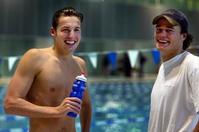 Zelfs Van den Hoogenbands tijd in de series, 1.47,53, bleek voor de concurrentie in de halve finales een brug te ver, maar in de virtuele tweestrijd met Ian Thorpe, die in Manchester in het kader van de Gemenebest Spelen in het water ligt, kreeg de Brabander een tikje. De Australiër kwam in Engeland tot 1.44,71, de tweede tijd ooit gezwommen, maar tot enige mate van ongerustheid leidde die tijd niet in het professionele Philips-kamp. Coach Jacco Verhaeren zag de tegenvoeter toevallig op zijn hotelkamer door het beeld snellen en kreeg daarbij voldoende mee om Thorpe's prestatie op de juiste wijze in te schatten. "Het toont aan dat hij verschrikkelijk hard kan zwemmen, maar om nou te zeggen dat ik diep onder de indruk was, nee. Hij zwom écht volle bak en kwam, met een wereldrecord van 1.44,06 achter zijn naam, maar iets minder dan zeven-iende van een seconde boven die tijd. Dan zie ik liever Pieter, die een persoonlijk en Europees record van 1.45,35 achter zijn naam heeft, met twee vingers in de neus deze tijd zwemmen." (Jacco Verhaeren blijft voor zijn succesvolle pupil Pieter van den Hoogenband de details verbeteren. (Foto: ANP))