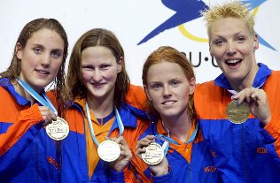 Zonder Inge de Bruijn in de gelederen heeft de vrouwenestafette toch een medaille weten te pakken op de EK zwemmen in Berlijn. Manon van Rooijen, Marleen Veldhuis, Chantal Groot en Wilma van Rijn werden knap derde, achter Duitsland dat met de herboren Sandra Völker en Franziska van Almsick een wereldrecord (3.36,00) zwom, en Zweden. De mannenestafette greep ondanks een inhaalrace van Pieter van den Hoogenband net naast eremetaal.