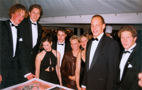Fondsen werven tijdens een veiling avond van de Stichting Topzwemmen Zuid-Nederland in 1999. V.l.n.r. Klaas Erik Zwering, Pieter van den Hoogenband, Madelon Baans, Jacco Verhaeren, Kirsten Vlieghuis, Angela Postma, Marcel Wouda en Mark Veens.
