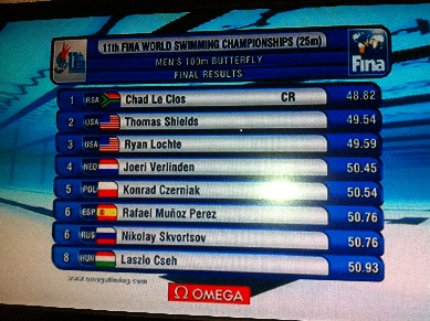 De Zuid-Afrikaan, die op de olympische 200 meter Michael Phelps verraste, bleek de snelste. Met 48,82 bleef hij de Amerikaanse concurrent Tom Shields (59.54) en Ryan Lochte (49.59) ruim voor.